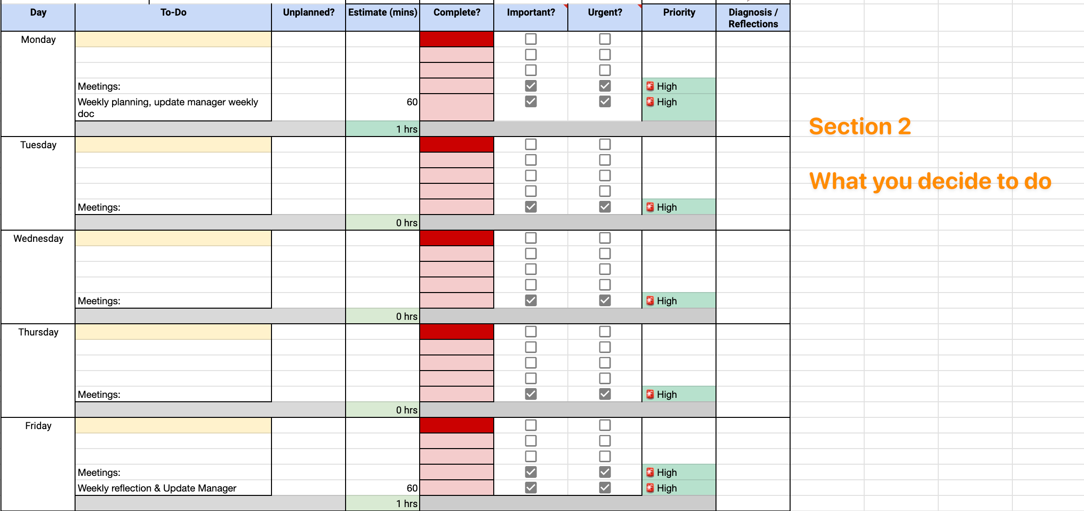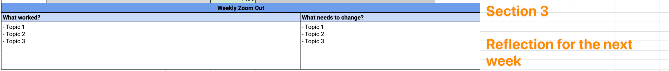 Disclaimer: I use a separate, longer, weekly reflection template, so I don’t use this section in the spreadsheet. But I still do the same reflection. I’ll write a separate article on my weekly reflection process.