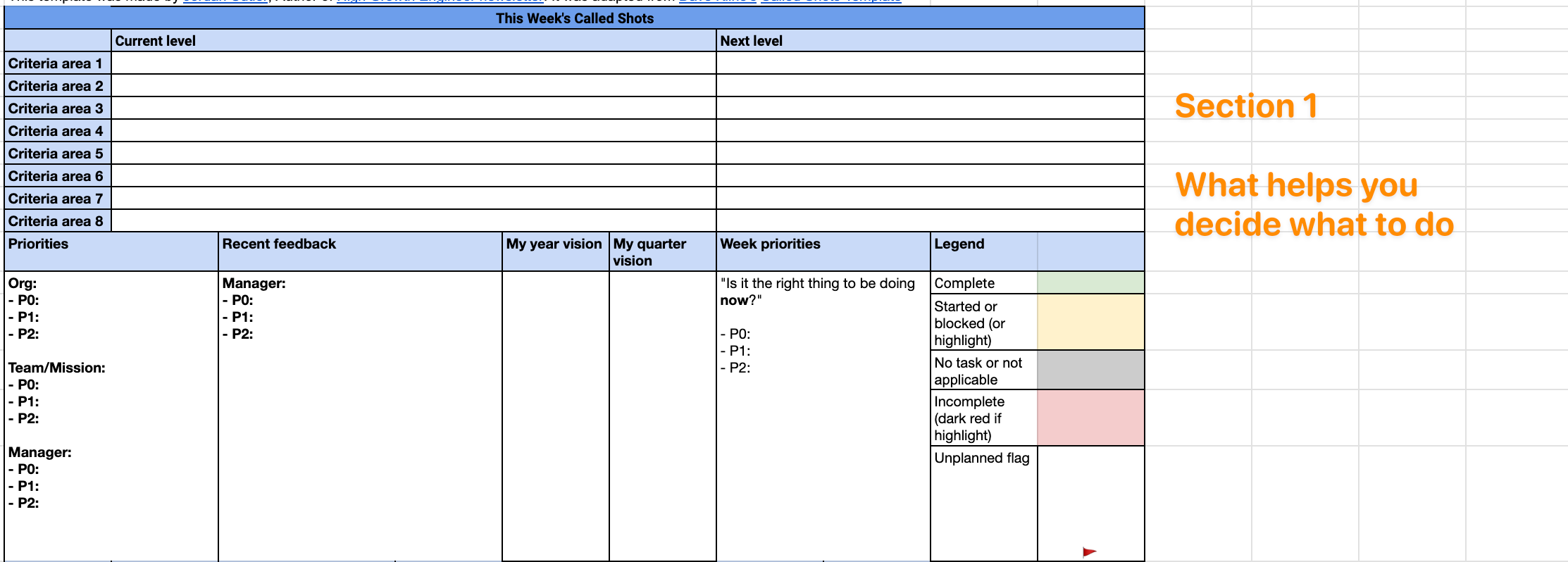 ✅ Solution: Section 1 goes through current & next-level criteria, team/manager priorities, and recent feedback to feed into what I should prioritize that week. All those inputs lead to me prioritizing the right work at the right time.