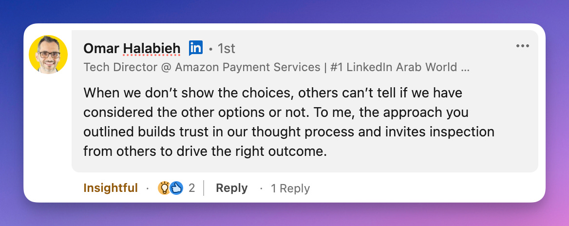 Bonus benefit of providing options: Without doing it, people can’t tell whether you’ve considered other approaches. That consideration builds shared empathy which gets you closer to a “yes.”