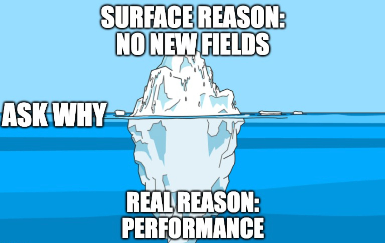 There you go! We went from: “We don’t want to add any new fields” → “What we really care about is performance.” Once you know the root problem you can address, you can do what you need while still addressing what they care about.