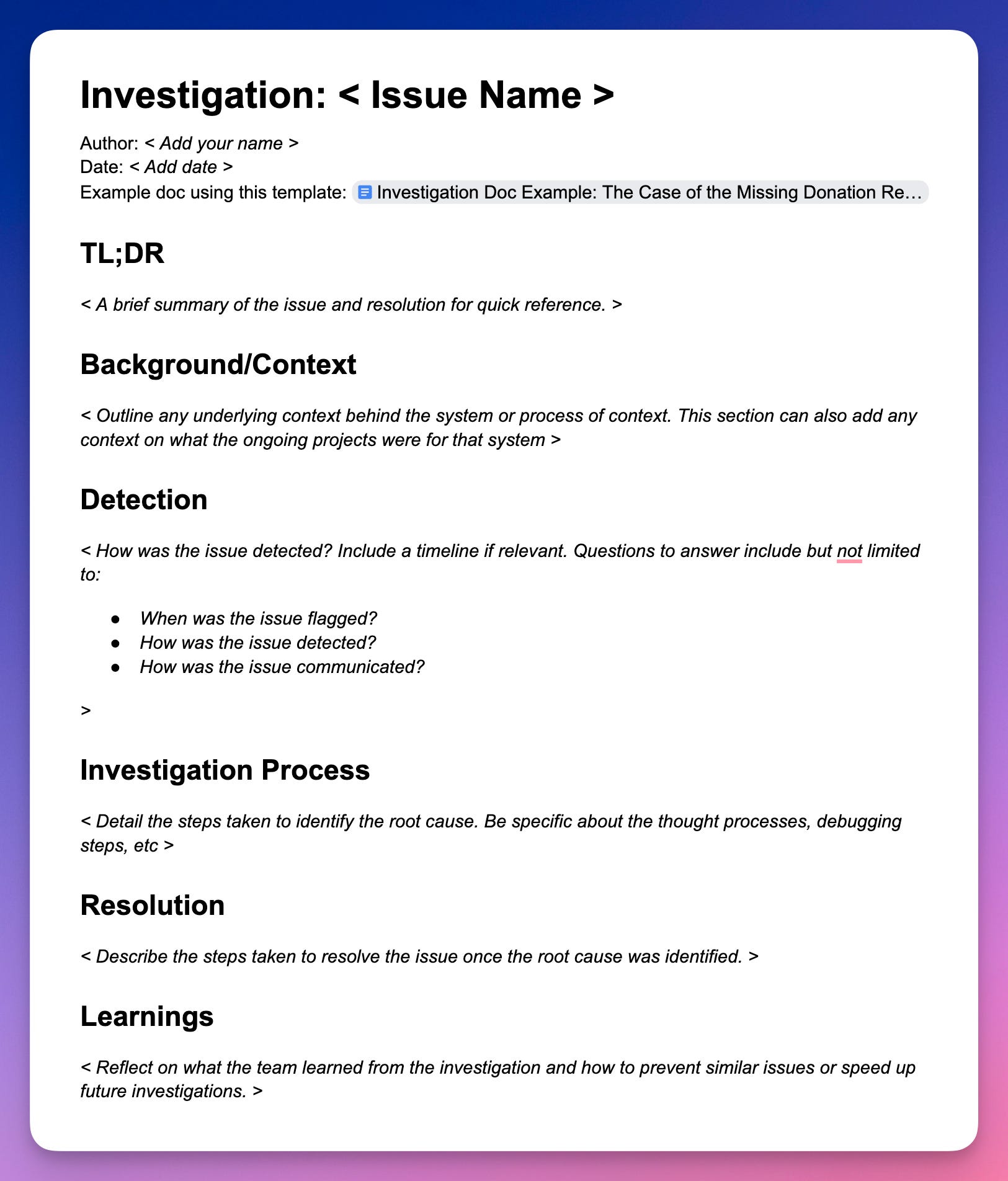 Investigation docs drive systematic problem solving, knowledge sharing, and career growth. You can use them for issues ranging from small bugs to big production issues