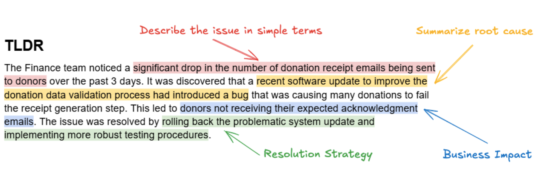 We’ll examine this example doc. It would be difficult to show an analysis of the full document in this post, but I’ll highlight the 2 most important sections: The “TLDR” and the “Investigation Process.”