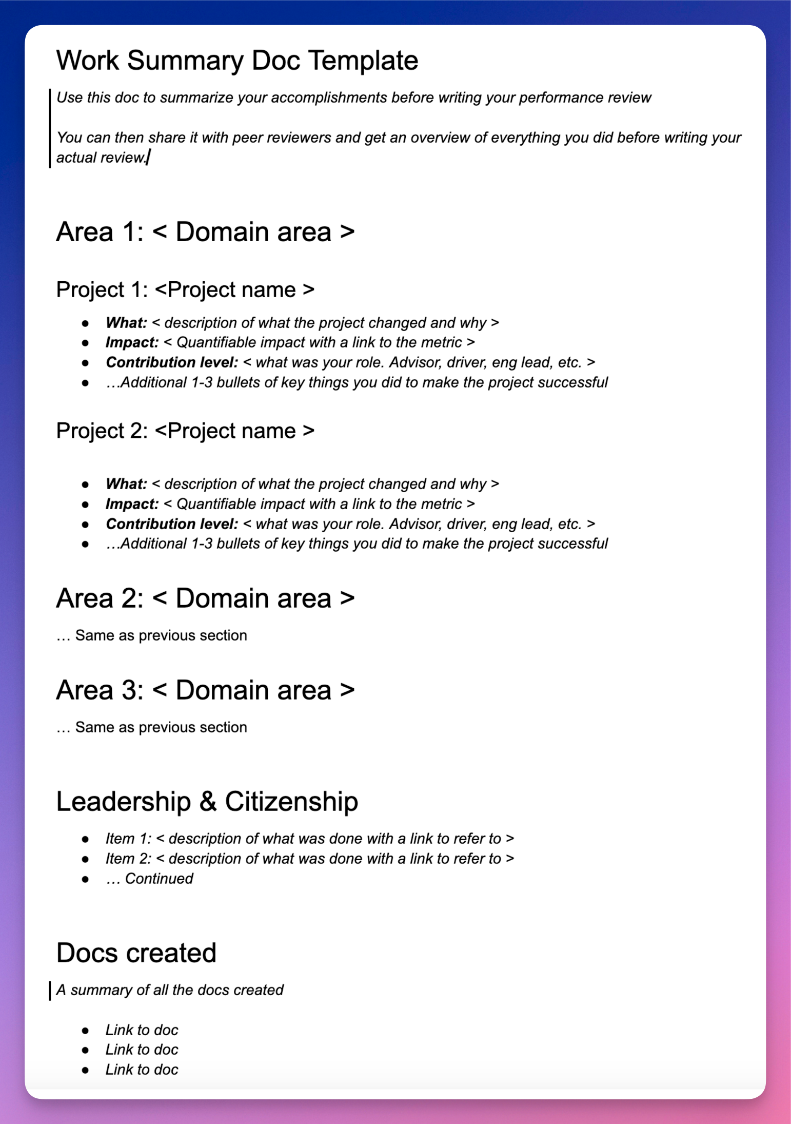 Instead of opening your performance review and writing from scratch, make a separate “Work Summary” doc. I learned this from my mentor recently, and it was so valuable when writing my actual review.