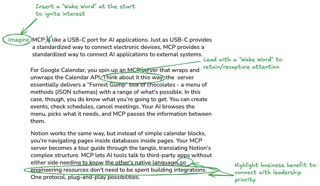 Why it works: This section uses both a metaphor (comparison without âlikeâ or âasâ) and alliteration. The metaphor, âYour MCP server becomes a tour guide,â helps listeners quickly get a general understanding of the relationship between MCP and Notion, while the alliteration (âplug-and-play possibilitiesâ) increases recall.