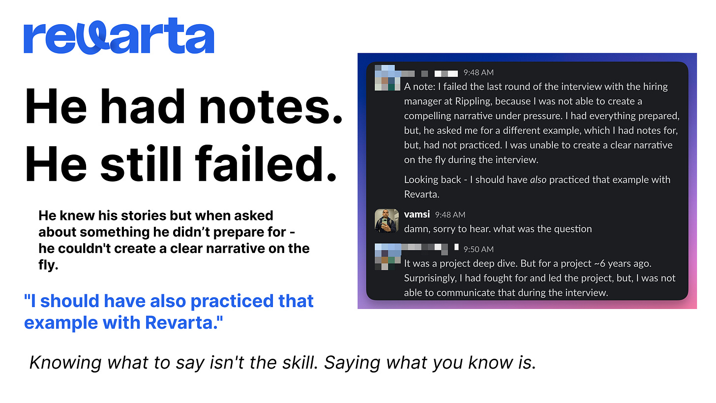 Most engineers prep by writing notes. But writing isnât practice. Revarta gives you live audio interviews with follow-up questions and feedback on whatâs actually landing.