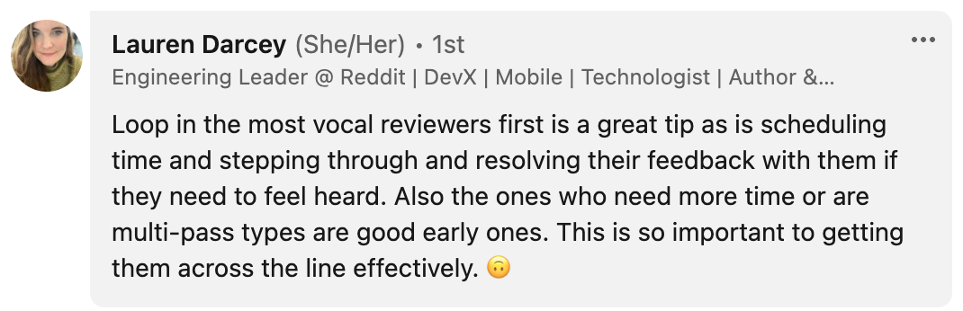 Doing this gets those vocal reviewers bought in to your doc because you incorporate their feedback early on.